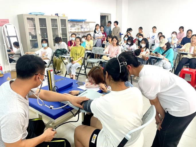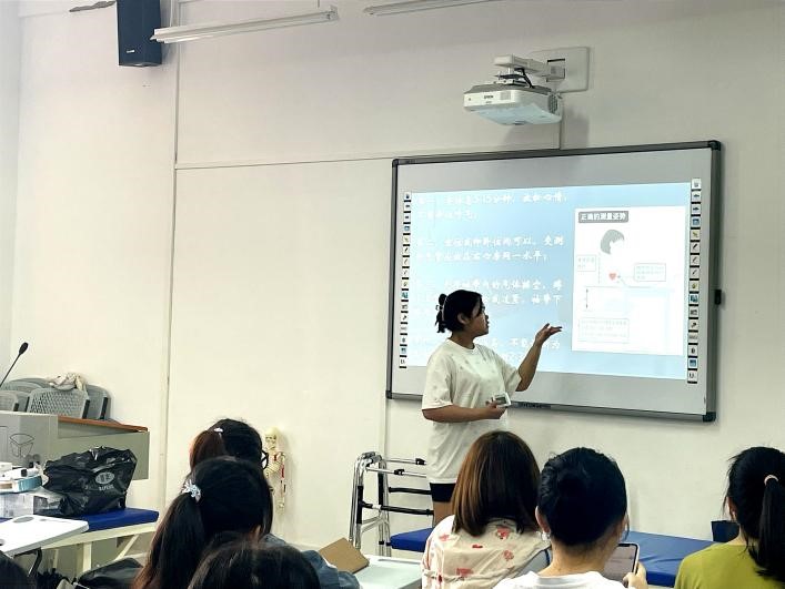 到了实践环节,同学们积极踊跃参与。7个小组有序地进行生命体征测量训练,如火如荼地讨论血压计、体温计的使用方法以及呼吸、脉搏的测量技巧。
