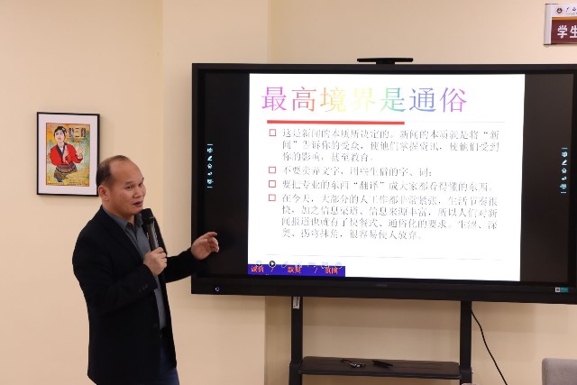 许海东副部长结合多年的宣传工作经历及研究成果,向同学们讲授“新闻”的含义及特点,特别指出“新闻”的“新”在于它的及时性和新奇性;“闻”在于它的客观性和真实性,写“新闻”要注意时效和质量,写作内容要客观真实,切忌主观臆断。随后,他在讲述新闻标题的重要性时提出两点:第一,题好一半文;第二,标题是消息的眼睛。强调好的标题是“新闻”成功的关键,在起新闻标题时应注意题文不符、滥摆噱头、逻辑不通等问题,要做到准确、简约、传神。接着,他举例分析了消息的结构,着重围绕“新闻标题、导语、主体如何写”“新闻写作中的常见注意事项”等内容对新闻写作的基本知识和写作技巧进行了深入浅出的讲解。最后向同学们讲授四段式写作指南:模仿——积累——练习——修改。首先要学会模仿推荐文章,从“经典”窥“天机”,其次模仿同类材料,把他用变“己用”,再通过不断地积累、练习和修改提高自己的写作水平,而后形成自己的写作风格。