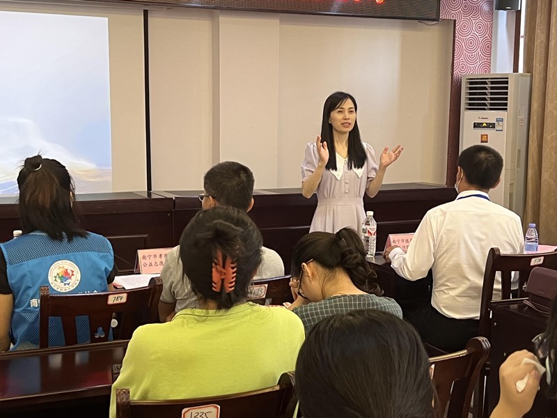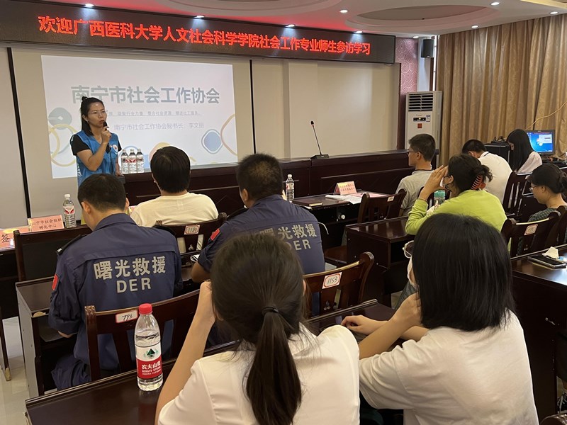 随后,师生们与南宁市社会工作协会、南宁市禁毒协会等5家社会组织代表座谈交流。各社会组织代表结合本机构的发展轨迹、特色服务项目的运作,展示了一幅幅社会组织成长的图景。同学们更近距离地理解社会工作专业的实务项目以及未来的发展前景,实践热情得到激发,纷纷就如何参与志愿服务、如何进行见习实习等问题进行提问。社会工作是一门实务性很强的专业。班级导师陈宇鼓励同学们充分利用课余时间参与志愿服务和社会服务项目,将平日所学专业知识与实际情况相结合,拓宽对社会工作各服务领域的认识,在实践与自我反思中不断积累知识和经验,为未来的职业发展奠定基础。