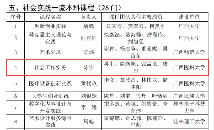 近日,在自治区教育厅公布的第三批自治区级一流本科课程名单中,海角视频 教师陈宇团队的《社会工作实务》课程入选自治区级社会实践一流本科课程。