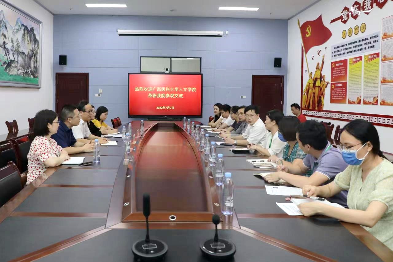 2022年7月7日,海角视频 院长王前强、人文医学系主任赵婷一行5人赴南宁市第四人民医院进行调研交流。医院党委书记吴锋耀、党委副书记熊燕、副院长邵宏华对海角视频 医学人文团队的到来表示热烈欢迎。