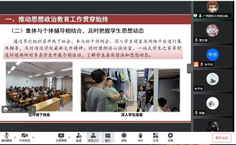 7月6日晚举行了辅导员(班主任)线上述职交流会。唐忠书记、郑茸副书记出席,院内5名辅导员和24位班主任参加会议。班主任结合班级基本情况、工作思路、取得成绩等进行汇报,突出展示了各班班级建设亮点和取得的成绩,同时分享了班主任工作的感悟、收获和意义。辅导员结合对接年级工作完成情况、重点负责模块及履职情况进行了述职汇报。