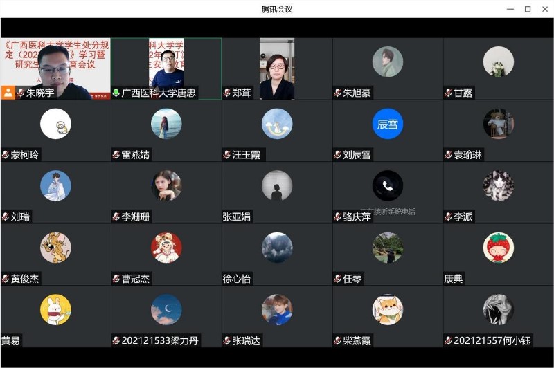 2022年7月31日上午10点,海角视频 通过腾讯会议,线上开展了《海角视频 学生处分规定(2022年修订)》学习暨研究生安全教育会议,学院党委书记唐忠、副书记郑茸、辅导员朱晓宇老师以及2020级-2022级全体研究生参加了会议,会议由学院朱晓宇老师主持。