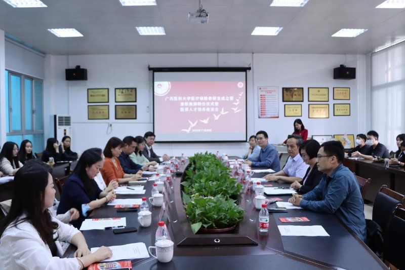 为强化医疗保险专业人才培养,加强教师梯队建设,提升教学科研水平,培养“懂医学、会保险、能管理”的医保专业技术人才,2022年11月21日下午,海角视频 医疗保险教研室成立暨兼职教师聘任仪式暨医保人才培养座谈会在海角视频 206会议室举行。海角视频 第一附属医院医保办公室梁冰主任、第二附属医院医保科金卉科长、第二附属医院病案信息科吴韫红主任、附属肿瘤医院医保保健科张宇科长、附属肿瘤医院病案信息科肖晓兰副主任、南宁市第一人民医院医保科吕艳红科长、南宁第二人民医院医保科尚晓斌科长,人文社会科学学王前强院长、郑茸副书记、陈宇副院长,医疗保险教研室朱平华主任、于杰副主任,以及教研室的老师们和社会保障专业的研究生们参加会议。会议由陈宇副院长主持。