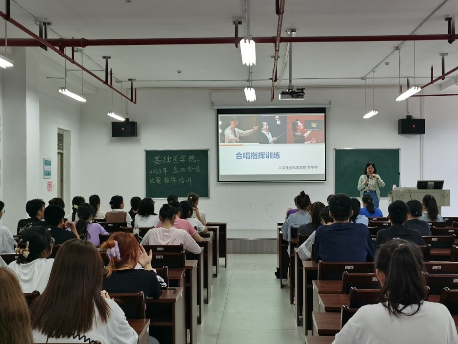 人文医学系党支部韦宇宁为基础医学院五四班歌比赛台唱指挥开展培训活动