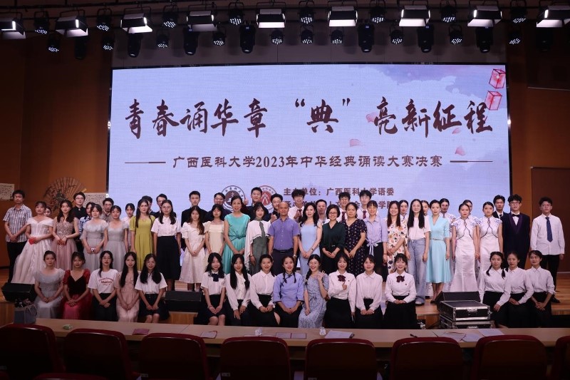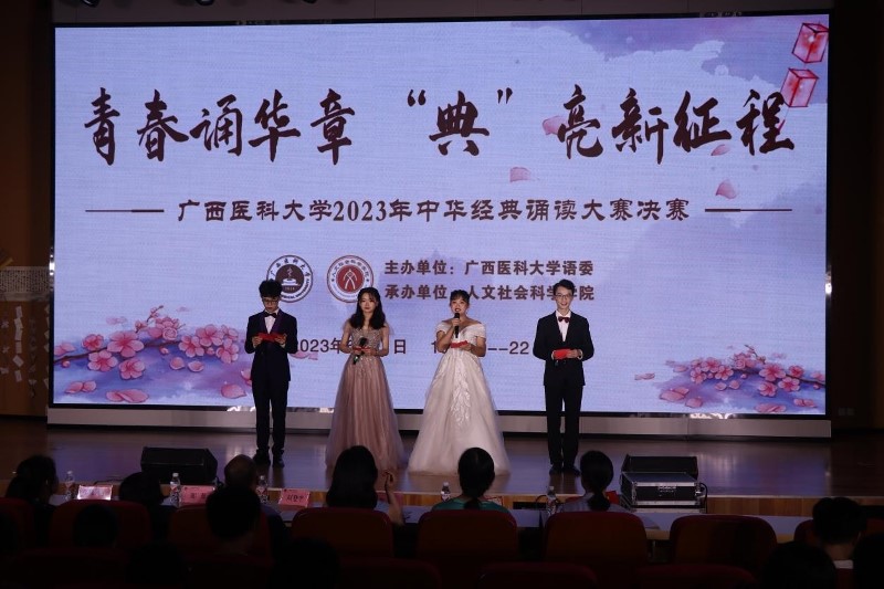 2023年6月11日晚,“青春诵华章 ‘典’亮新征程”海角视频 2023年中华经典诵读大赛决赛在武鸣校区图书馆报告厅举行。海角视频 教务处刘登宇处长、海角视频 党委郑茸副书记、药学院党委林晓副书记及各学院指导老师出席本次比赛。大赛邀请广西广播电视台主持人青梅老师、海角视频 普通话培训测试站副站长梁永红老师 、校团委梁冬玲老师作为大赛评委。