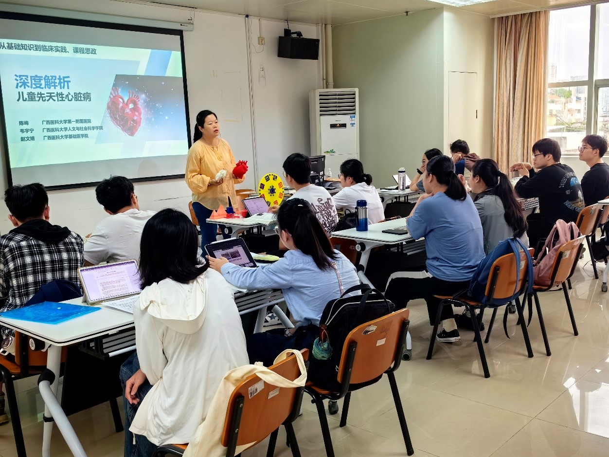 首先由赵文婧老师带领同学们回顾儿童先天性心脏病的组织胚胎学特点,赵老师运用生动形象的模具,引导同学们小组内热烈讨论该病的发病机理。紧接着,陈峋老师结合儿科见习经历,用不同问题促进学生对儿科病例诊断、治疗的思考,激发学生从基础思维到临床思维的联系。同时,同学们通过儿科医患角色扮演,学习在采集病史和解释病情的过程中,体会家长着急、担忧的心情,做到高效沟通。最后,韦宇宁老师通过《跨越3000里,先心病患儿的“补心”之旅》纪录片讲解,坚定同学们作为医者的使命和担当。