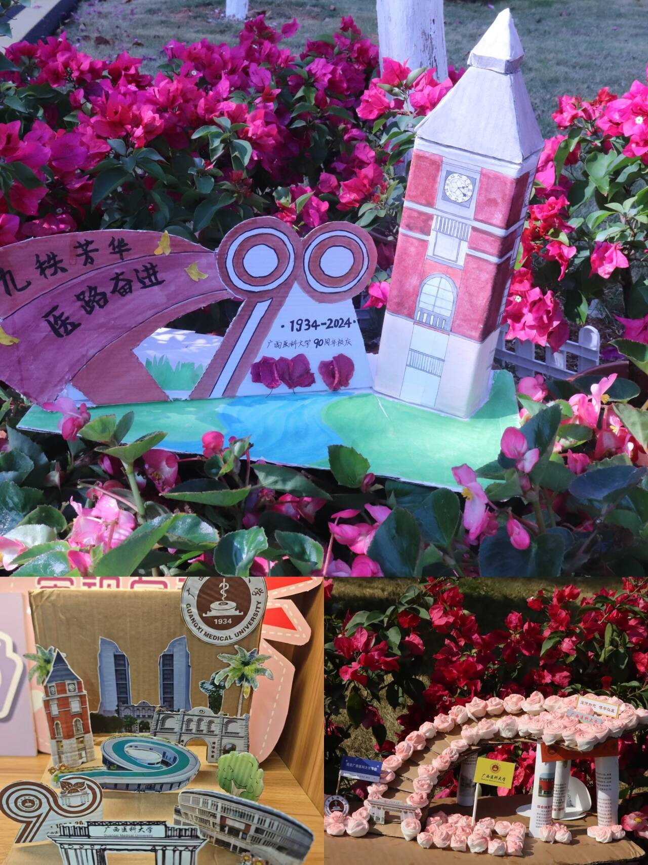 学院心理工作站举办“翰墨飘香迎九秩,书法育人寄深情”校庆主题育人活动,同学们以书法为舟,扬帆启航,每一笔都饱含深情,每一字都承载着对母校的祝福和期望。学院在学生社区开展“喜迎九十校庆,共筑清廉家园”创意纸箱改造活动。同学们以宿舍为单位,利用废弃纸箱等物品进行改造,一件件含有校庆元素的精美原创手工艺作品变废为宝,旧纸变新辉,红心巧手为母校庆生。组织“九秩芳华,影留青春”我与母校合个影活动。同学们在各个校庆标志前打卡留影,与90岁生日的母校相遇,美好一同被定格在校庆的方框中。